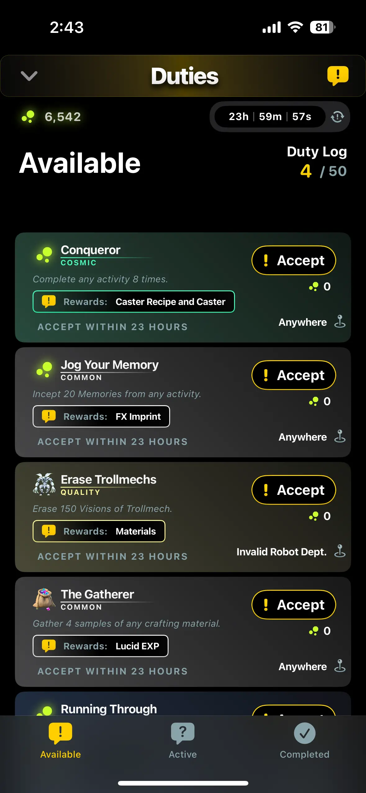 New Duties become available every 24 hours and will cycle out after that time if not Accepted for a Memories cost. Once Accepted, Duties can be completed in any amount of time, but the maximum number of active Duties is limited. By default, the limit is 20, and with the Stimulant in-app purchase it is increased to 50.