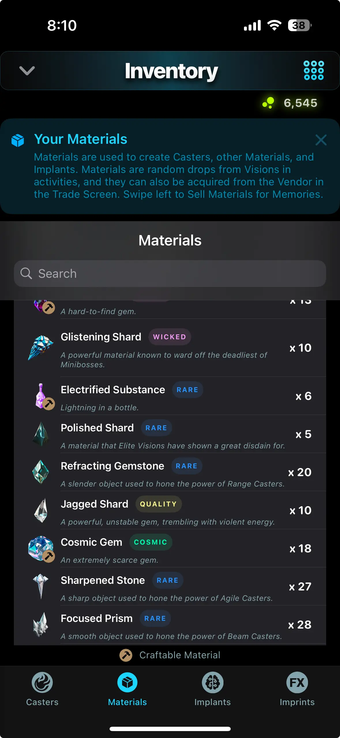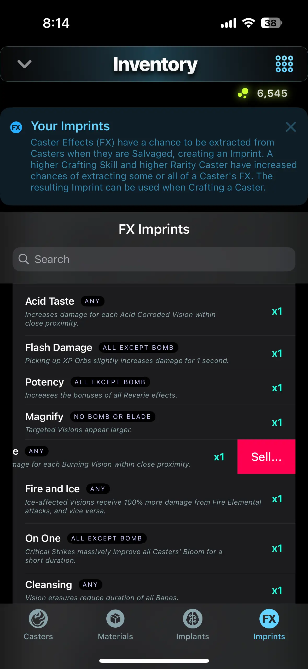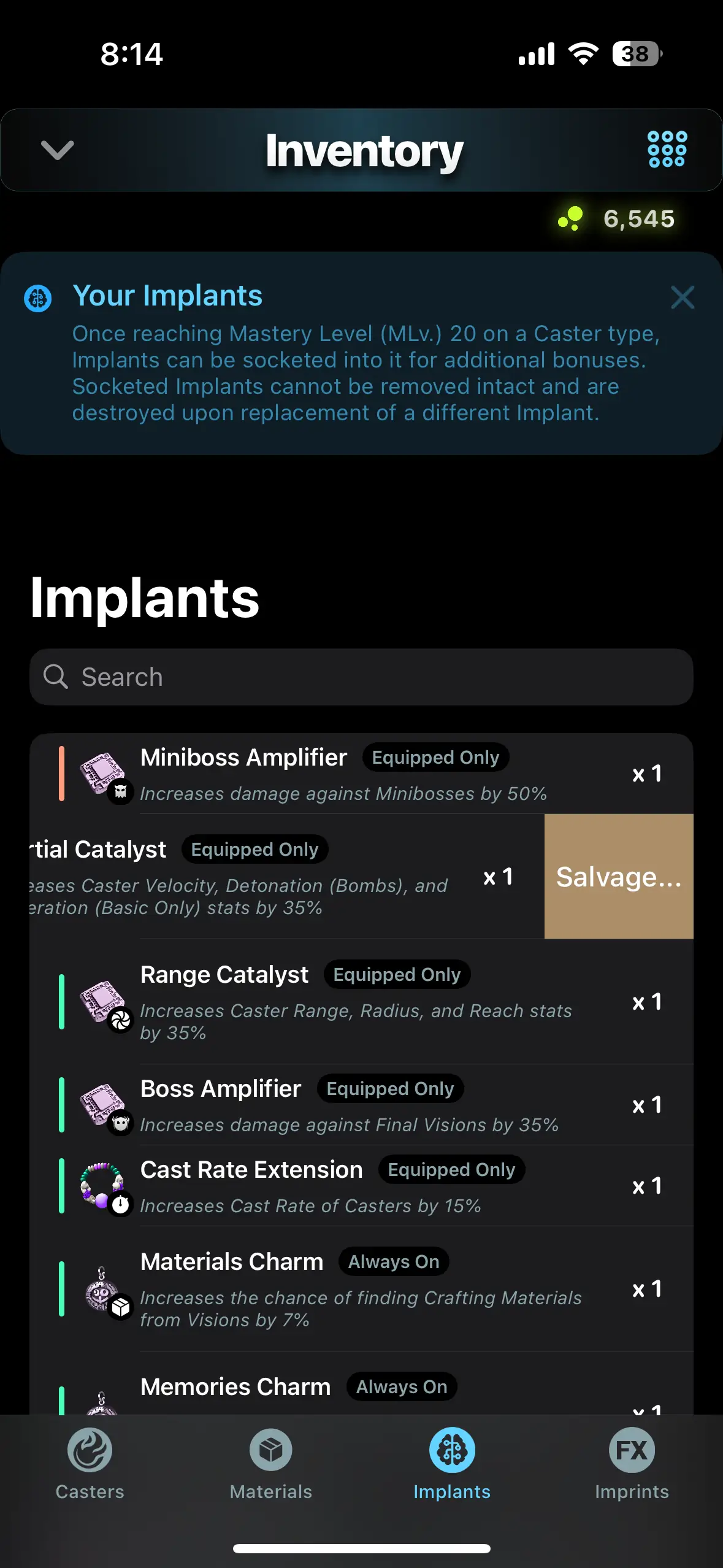 Your Inventory keeps track of all your Casters, Materials, Implants, and FX Imprints. From this screen, you can sell Casters, Materials, Implants, and FX Imprints and you can also salvage Casters and Implants for extra Materials.