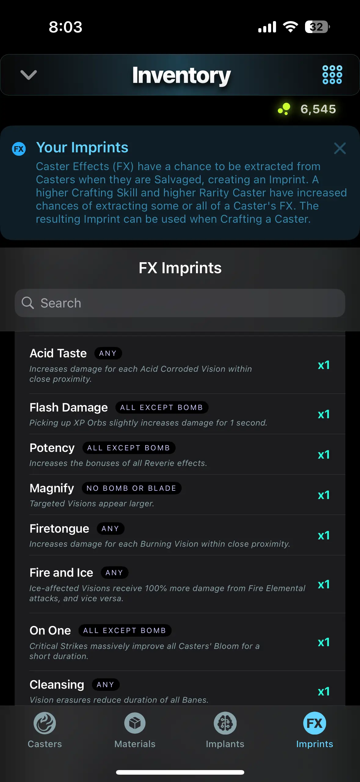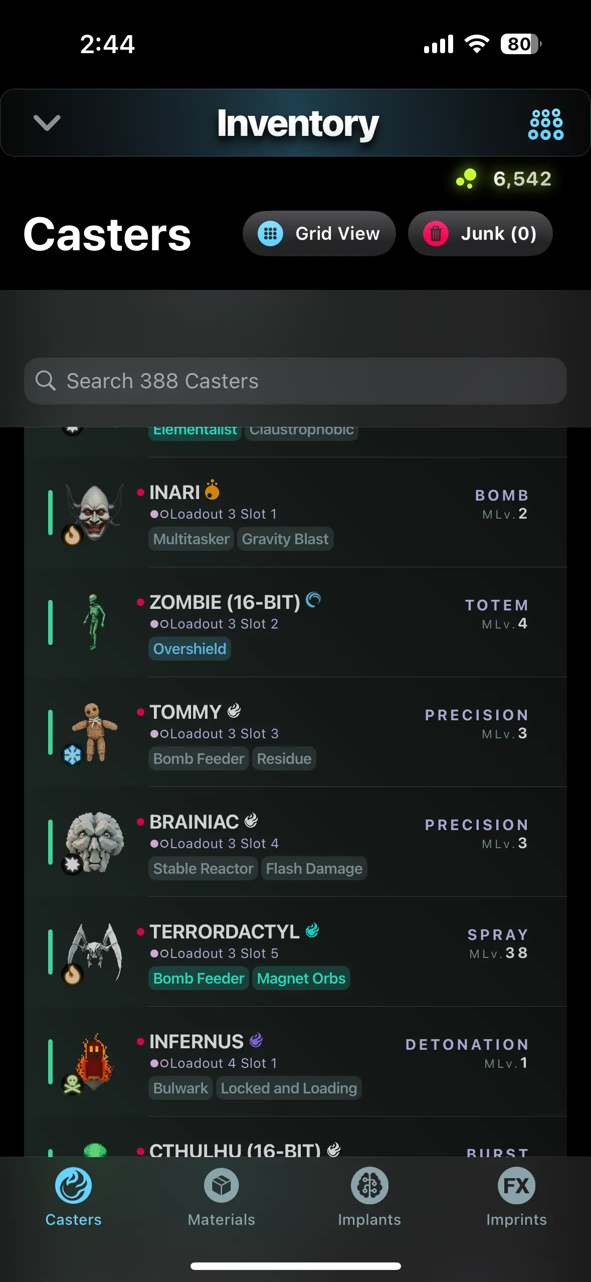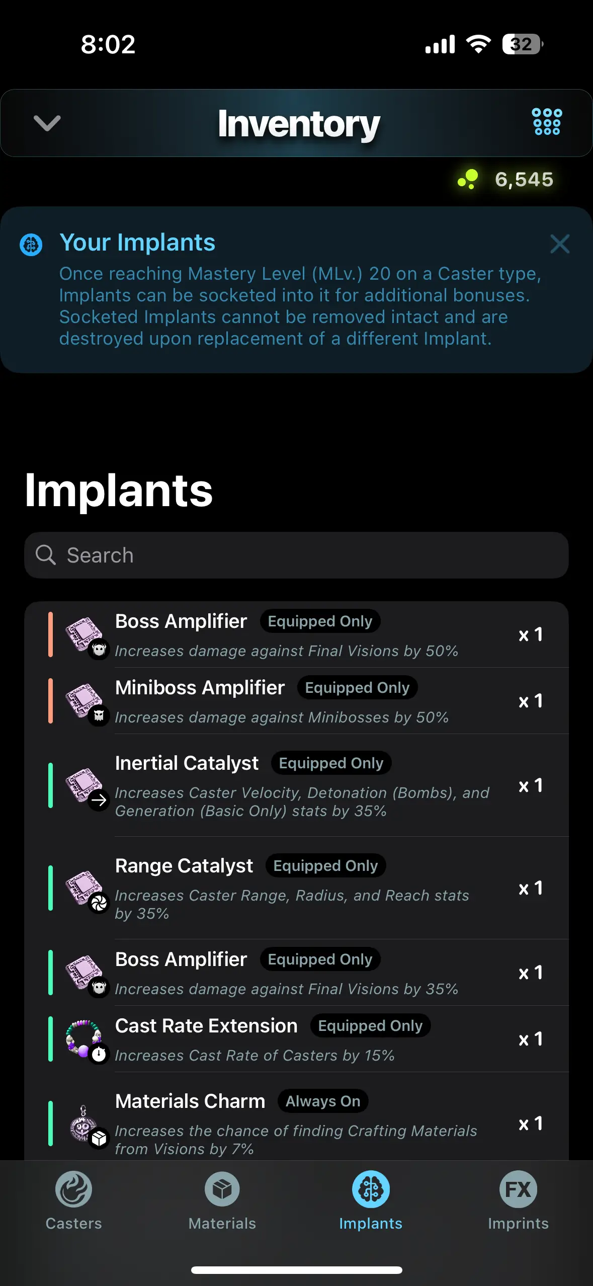Your Inventory keeps track of all your Casters, Materials, Implants, and FX Imprints. From this screen, you can sell Casters, Materials, Implants, and FX Imprints and you can also salvage Casters and Implants for extra Materials.