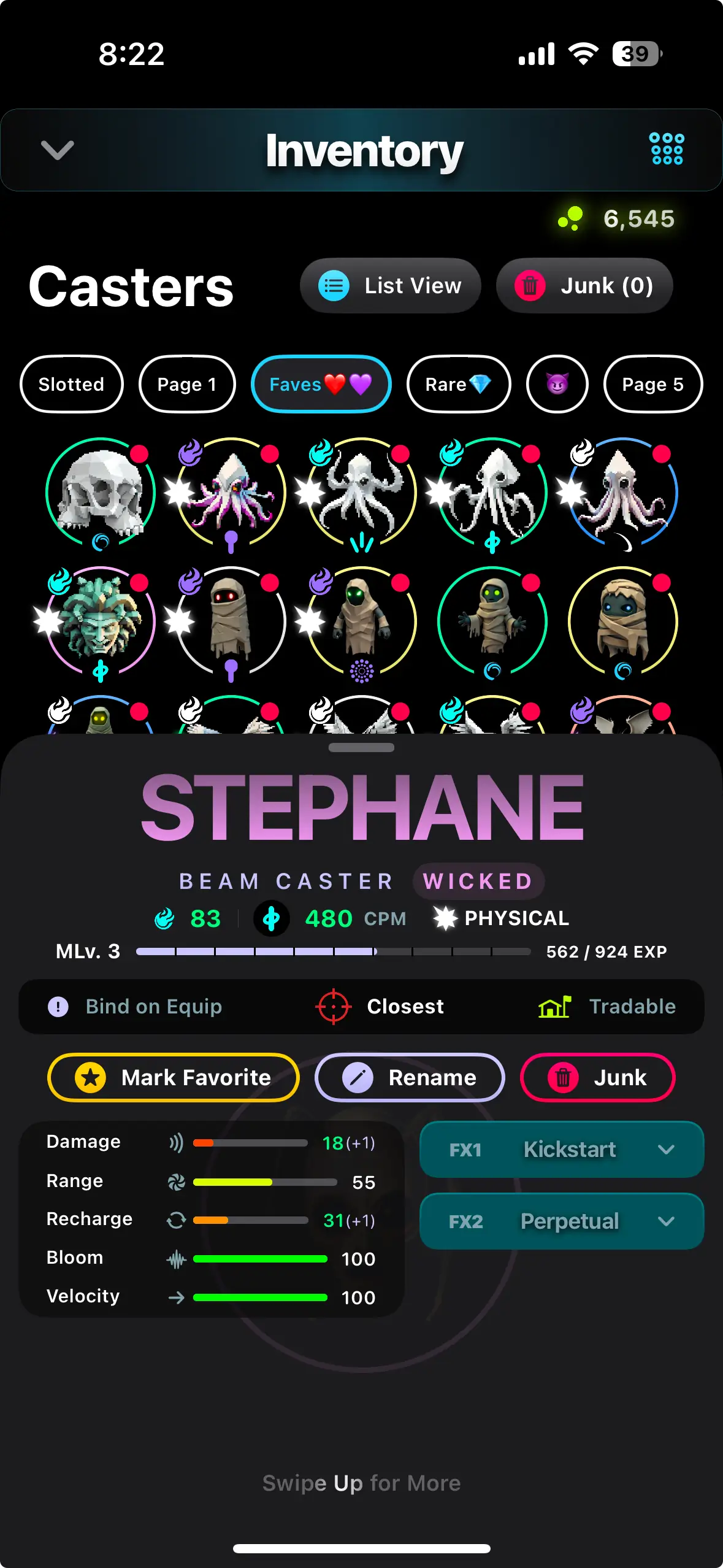 Casters can also be configured to change their targeting type (if the Mastery Level requirement is met) and Marked as Favorite. Marking a Caster as Favorite will show a star icon in your Inventory and bring it to the top of the List View screen.