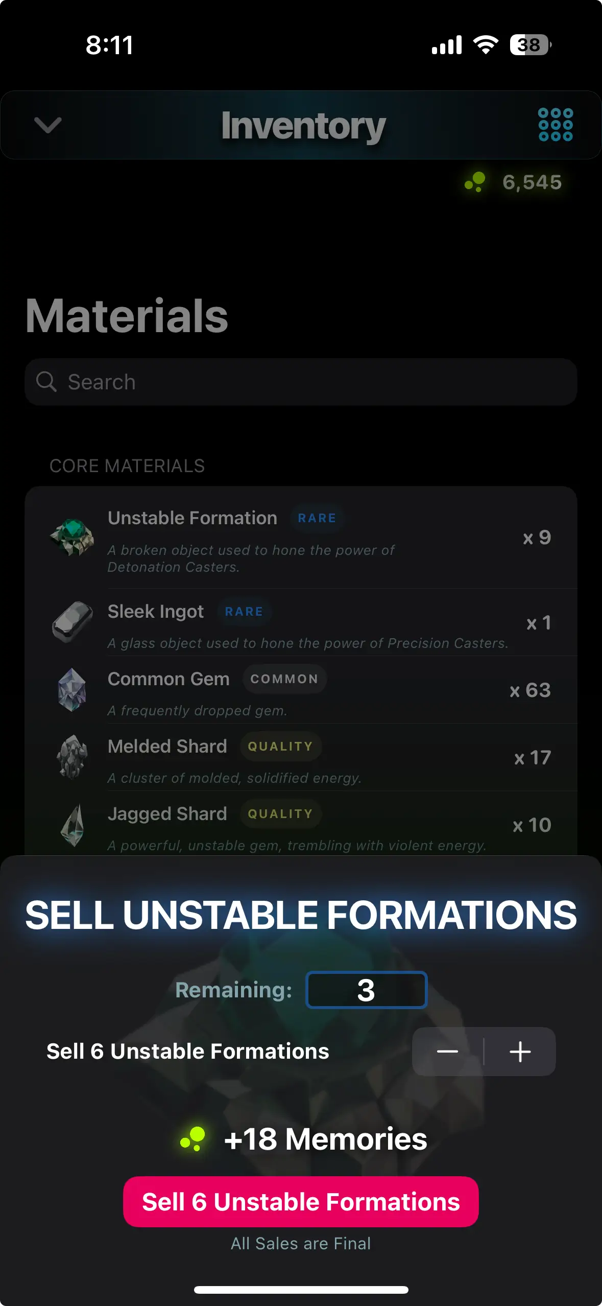 The Materials listed in your Inventory are in a list view and allow you to sell them individually or in bulk for Memories. You can sell Materials by swiping them left.